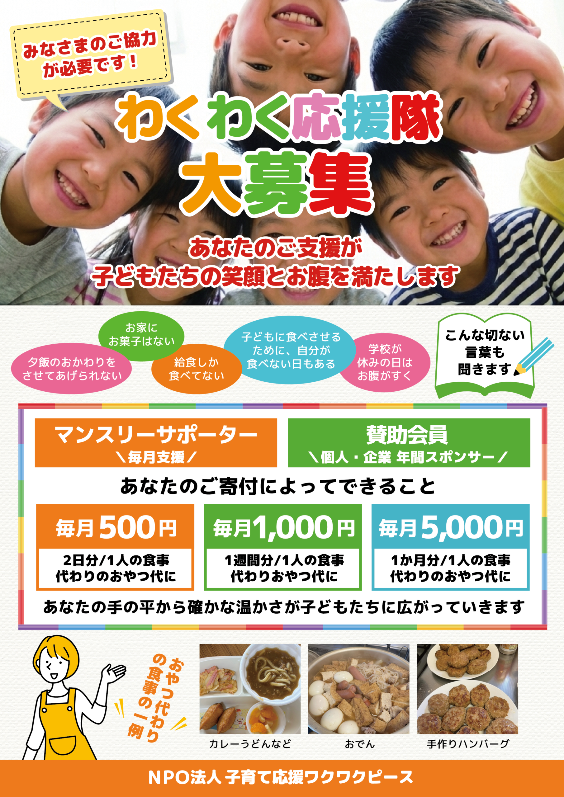 わくわく応援隊 サポートメンバー大募集 サポートメンバー大募集 入会特典としてHPやイベント等のチラシにロゴやお名前等を掲載させていただきます。 入会特典としてHPやイベント等のチラシにロゴやお名前等を掲載させていただきます。 ご寄付頂いた企業・個人様ご紹介 わくわく応援隊入会申込フォーム 必須お名前 必須ふりがな 必須郵便番号 必須ご住所 任意電話番号 必須メールアドレス 必須会員種別 賛助会員【サポーターメンバー 個人】3,000円/年賛助会員【サポーター 企業・団体】 10,000円/年 必須お支払い方法 銀行振込現金支払 必須送付方法 書類や当法人の活動報告等の送付方法 郵送メール 必須備考欄 上記内容でよろしければチェックを入れて送信してください。 Δ このサイトはreCAPTCHAによって保護されており、Googleのプライバシーポリシーと利用規約が適用されます。
